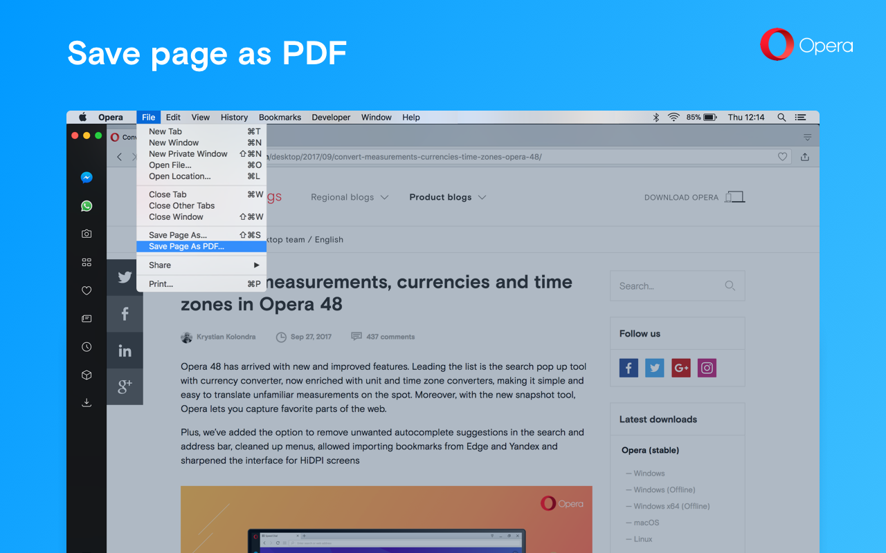 Opera has already been offering a traditional way to create a PDF. You first have to print the current page. In your printing dialog box, choose “Save as PDF” as your printer. There are multiple options that control how the PDF will be generated including layout, headers,
