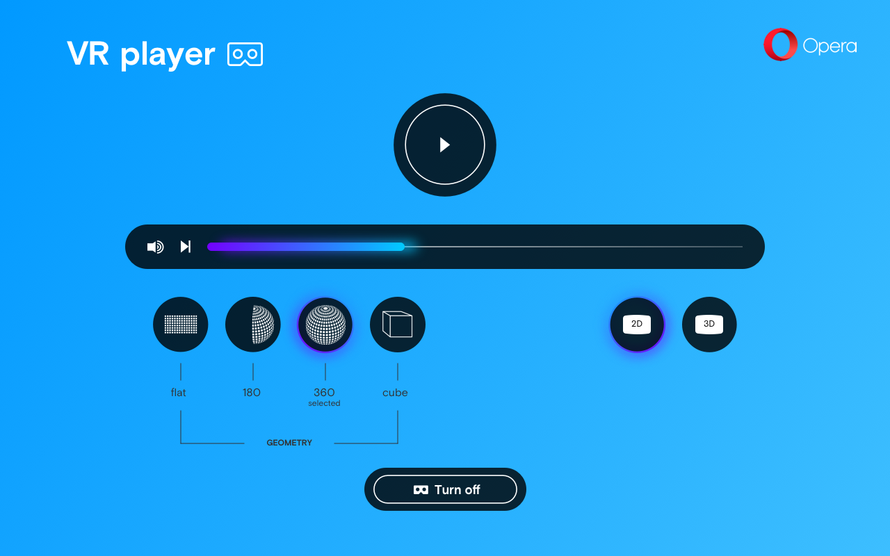 By clicking the “Turn off” button in the Opera VR 360 Player, your device will return to its native home screen.