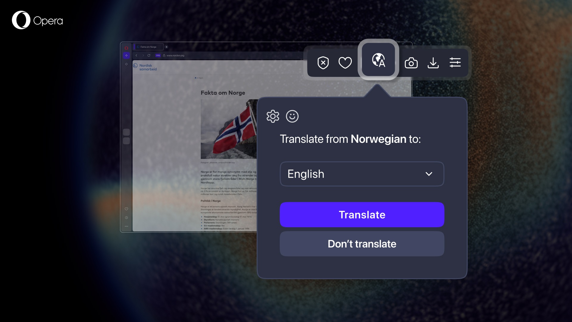 The internet is a palace where we all come together and share, among many things, our languages. With the built-in translator in Opera One you can translate webpages from over forty languages into your native one, and access information that would otherwise be more difficult to acquire.