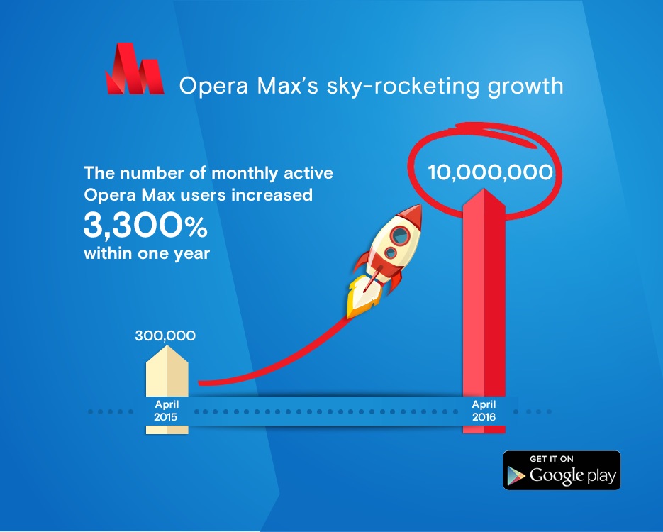 Angka ini meningkat 3,300% dalam kurun waktu satu tahun, yang berawal dari 300 ribu pengguna di bulan April 2015 hingga 10 juta pengguna di April 2016. Ini adalah pencapaian terbesar Opera Max sejak diluncurkan di tahun 2014.