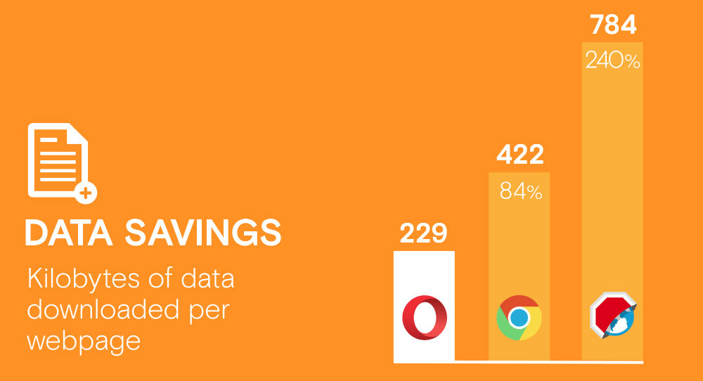Terkait penghematan data, rata-rata banyaknya data yang didownload per halaman web setelah iklan dihapus pada Opera di Android adalah 229 kb. Sedangkan Chrome mengkonsumsi 47% lebih banyak data dan Adblock Browser adalah yang paling boros dengan menghabiskan 3,4 kali data lebih banyak.