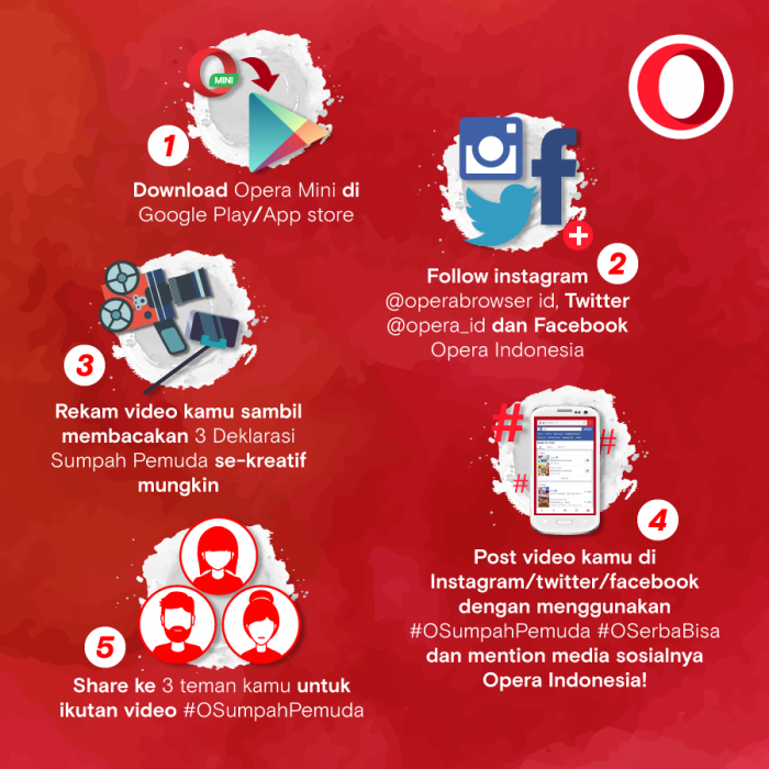 Video kompetisi #OSumpahPemuda ini akan diadakan mulai dari tanggal 20 – 26 Oktober 2017 dan akan dilaksanakan serentak di seluruh media sosial Opera Indonesia. Dengan tujuan untuk kembali mengingat sejarah pada masa pembacaan teks sumpah pemuda pada waktu Kongres Pemuda di Jakarta 27-28 Oktober 1928, kami mengajak para pemuda – pemudi, untuk kembali membacakan teks sumpah pemuda tersebut. Video ini pun diharapkan dapat mempersatukan pemuda – pemudi Indonesia melalui internet.