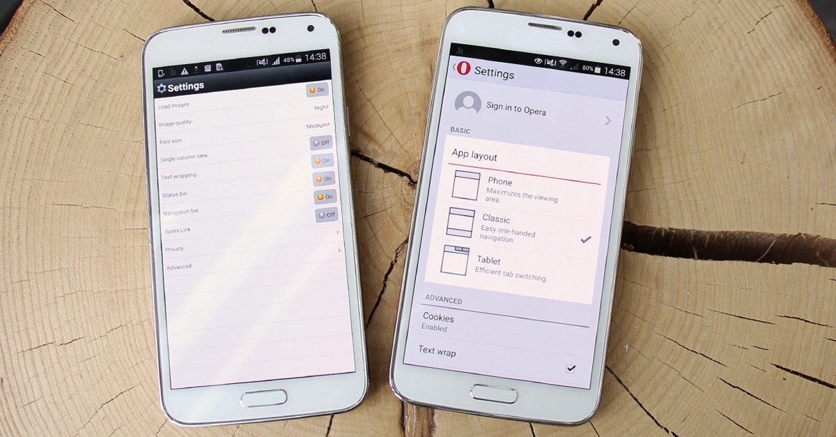 Phone layout maximizes your viewing area by reducing the combined address and search bar and menu options to one bar across the top. Classic layout is most like the old Opera Mini, giving the address and search bar the full width, for those of you more comfortable sticking with the traditional look. Tablet layout is designed to give you efficient tab switching.