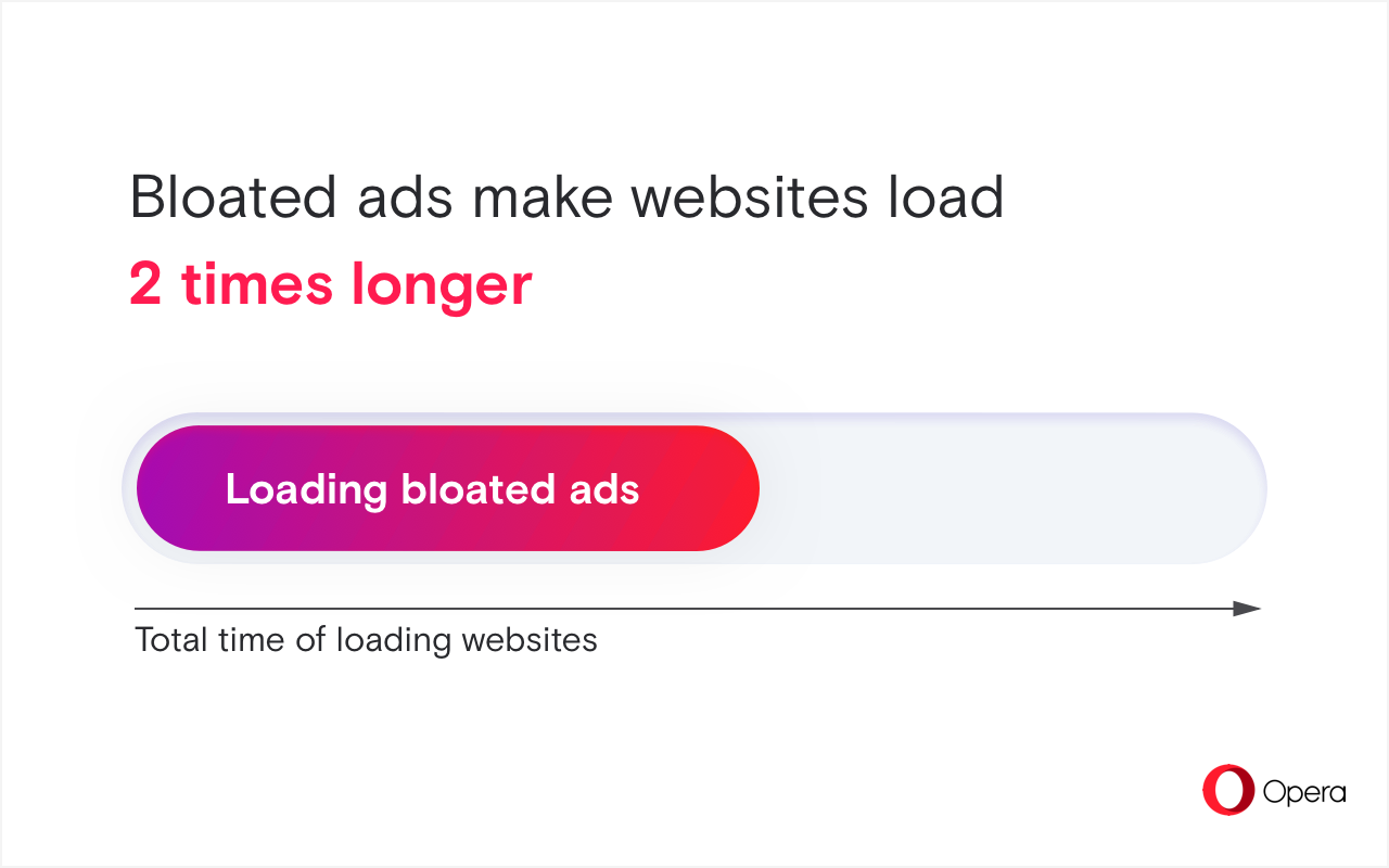 Opera conducted its online ad research* on the nine most popular news websites worldwide (according to SimilarWeb). The results showed that, on average, a single website is 51% slower when loading with unblocked ads (3.8 seconds) compared when loading with blocked ads (1.89 seconds). In other words, news websites could be displayed 51% faster if ads were blocked.