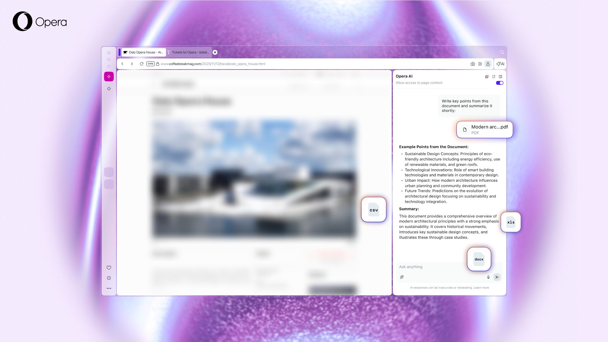 File analysis: Upload images or supported file types like spreadsheets (.xls, .xlsx, .ods), video (.mp4, .mpeg), audio (.mp3), and other types of files like .pdf, .csv, .txt, .json, .odt, .doc, and .docx. Opera AI can help you analyze those files and ask specific questions about them.